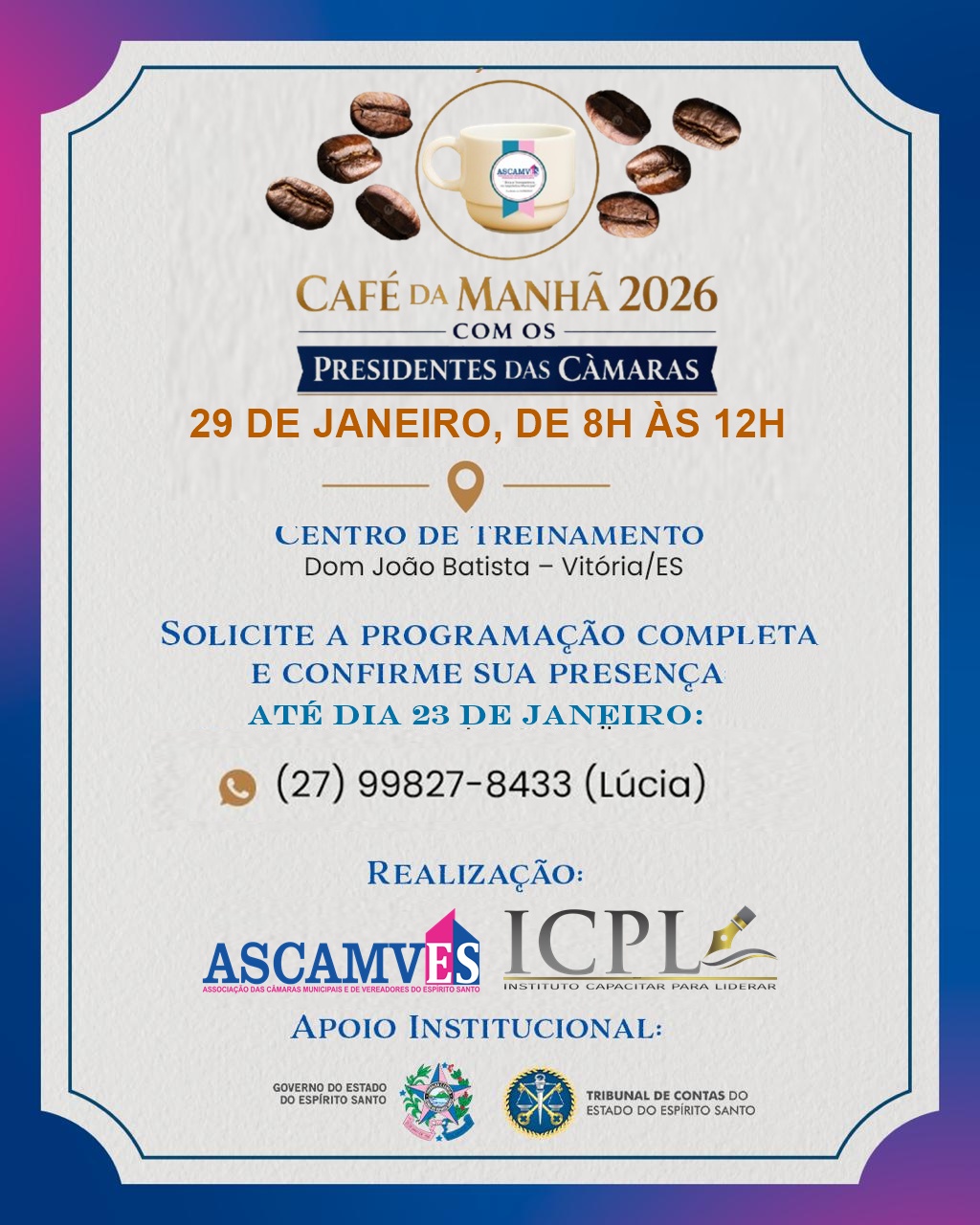 A Associação das Câmaras Municipais e de Vereadores do Estado do Espírito Santo (ASCAMVES) realizará, no dia 29 de janeiro de 2026, um Café da Manhã Institucional com os Presidentes das Câmaras Municipais, reunindo lideranças do Legislativo capixaba para um momento de diálogo, integração e alinhamento de ações para o novo ano legislativo.